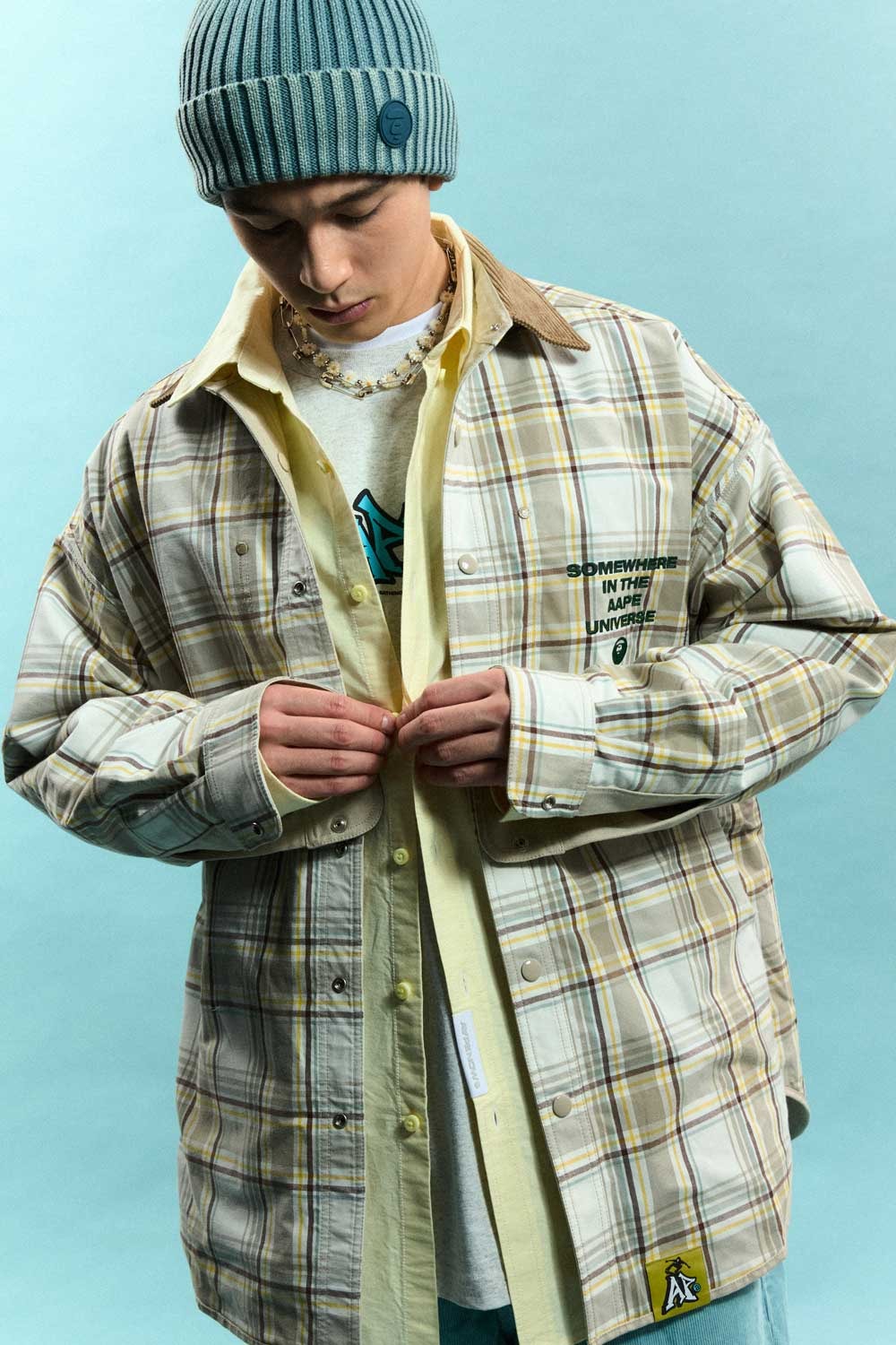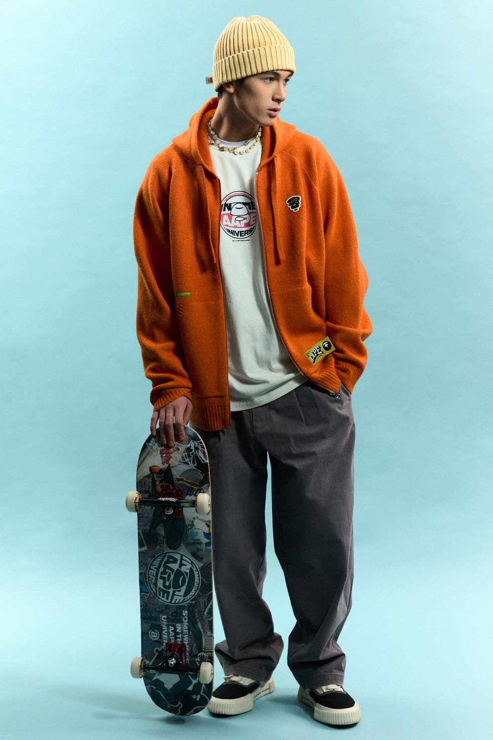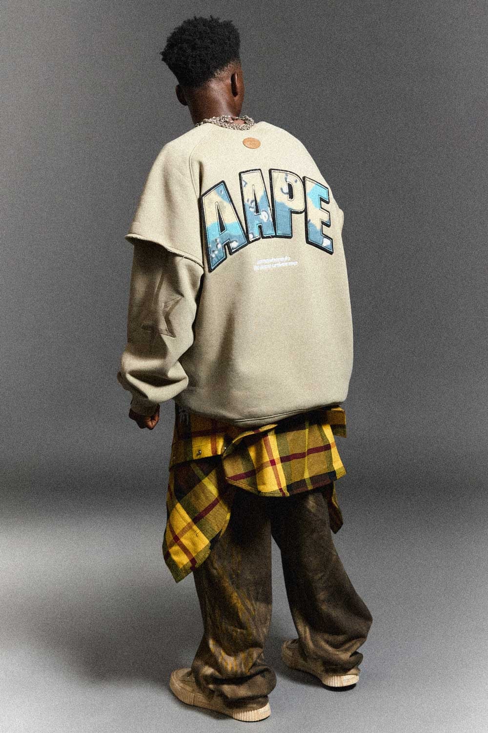 āAAPE SKATEā pulls from the creative and rebellious spirit of American skate culture, using hand drawn-graffiti prints, color block plaid patterns, and fish-eye motion blur design elements. From plush and reversible jackets to capri pants, the skate collection uses a bold color palette to showcase the essence of the brandās defiant and daring sensibility. āAAPE HIP-HOPā follows a similar dauntless nature with its inspiration. Following the free-spirited but innovative history of hip-hop, this collection leans on the theatrics of the genreās visual culture. Utilizing AAPEās signature desert camo and faux animal print paired with cement tones of black gray and brown, the line is inspired by the stage attire of hip-hopās rappers. With bomber jackets, hoodies, knit set, and denim staples, the collection empowers wearers to embrace the nonchalance of the next generation.